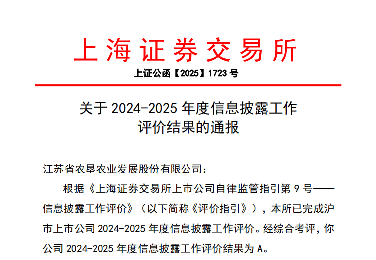 近日,上海證券交易所公布滬市主板上市公司2024-2025年度信息披露工作評價結果,蘇墾農發(fā)(股票代碼:601952)再次獲評最高等級“A”級。至此,公司已連續(xù)六年蟬聯(lián)上交所信息披露最高評級。
