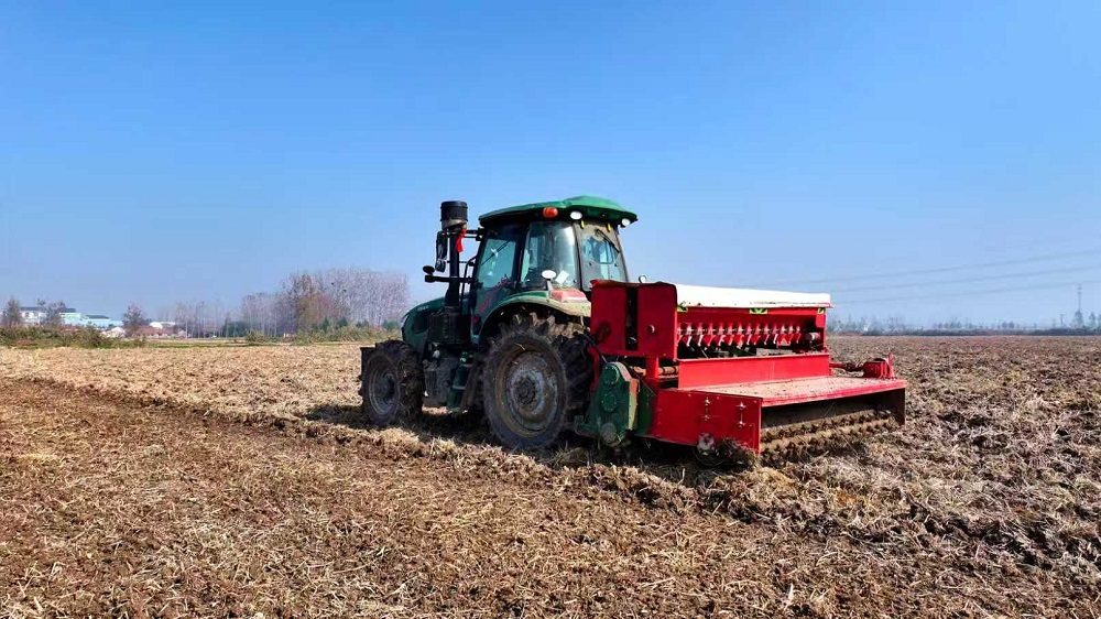 精細化管理是今年秋播工作的又一亮點。各外拓基地根據(jù)當?shù)貙嶋H情況,制定了詳細的秋播技術(shù)方案和田間管理預(yù)案?;剞k全體人員分區(qū)包干,駐點跟蹤服務(wù),對整地質(zhì)量、播種深度、密度和施肥量等進行專項督查指導(dǎo),做到“一區(qū)一策”,實現(xiàn)精準化管理。同時,加強土壤墑情監(jiān)測,密切關(guān)注天氣變化,及時做好抗旱防澇準備,確保秋播小麥在最佳環(huán)境下生長。此外,充分發(fā)揮現(xiàn)代農(nóng)業(yè)機械化優(yōu)勢,外聯(lián)大批先進、智能的農(nóng)業(yè)機械參與秋播作業(yè)。根據(jù)今年土壤墑情,選擇小履帶拖拉機進行開溝作業(yè),安裝了北斗導(dǎo)航系統(tǒng)的智能化播種機實現(xiàn)直線播種、播深一致,不僅大幅提升了作業(yè)效率和質(zhì)量,也為后續(xù)的田間管理和機械化收獲創(chuàng)造了有利條件。